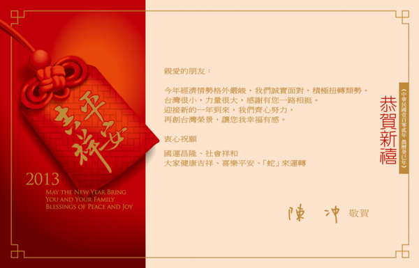 第三 今年元旦行政院長陳冲先生送來的祝福