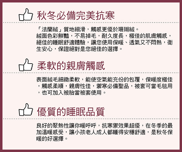 *法蘭絨超細滑觸感,輕巧保暖,纖維密度高、絨面豐滿柔順,給您溫柔呵護與高雅時尚生活!