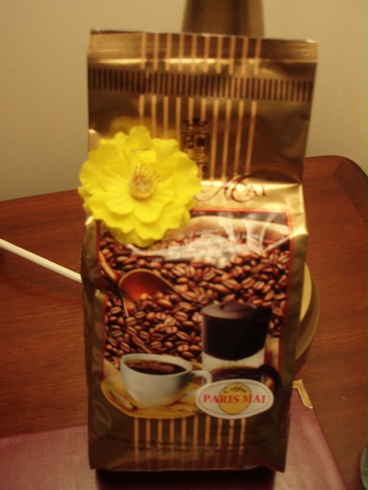 但看到包裝精美的咖啡差點傻眼,越南老師興奮地說,「這是本地精品喔!上面才會有代表高級品的黃色花朵」,但怎麼看這朵小黃花好像我們參加喪禮時,喪家會提供讓你別在胸前的「黃花」,心裡一陣發毛,心想這個要是帶回家,大概會被媽媽罵吧,沒事帶朵這樣的「黃花」回家做啥?