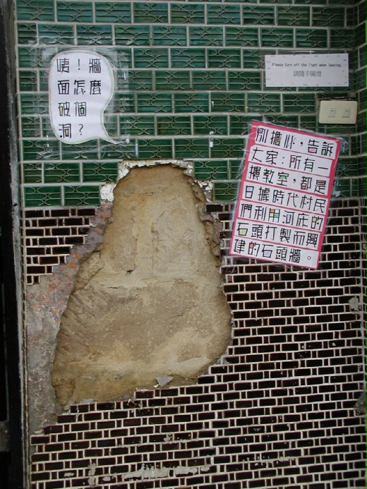 吉林國小已有七十年歷史,有的老教室的建築與其他學校不同,是以石頭砌牆打造,牆壁比磚造的更厚實,學校還故意在石頭柱子上打出一個缺口,讓大家可以看到原始的構造。