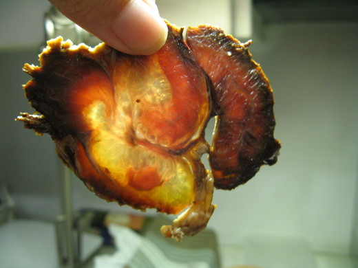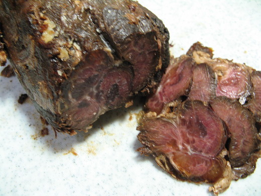 醬好的牛肉還溼答答的,通常此時切片起來,外層的肉會有點散碎感,我通常會把這些牛肉不加蓋丟到冰箱冰個幾天,讓牛肉稍為脫水,表層收乾後再食用,當然也可以選擇用電風扇或其他方法將其風乾些。這收乾的醬牛肉再切片食用,口感有點彈Q,比剛醬好時軟爛的口感好上太多,加上鼻子吐氣時,連帶湧上的鼻頭香,無怪數百年來,這道菜一直為人們所熱愛。除了這牛腱外,牛筋更是一絕,牛筋滷得好,就像果凍般的彈牙,完全顛覆了牛筋嚼多不爛的刻版印象,漸層的醬色,由內而外,由深而淺,所有吃過我醬牛肉的朋友無一不叫好,但在吃過醬牛筋後,更是叫絕。醬完牛肉後,整個屋子瀰漫著濃郁的醬香,整整一個星期後才逐漸消散,想想這還真是有點可怕呢!看來下回一次多醬些起來放冷凍,才可少醬幾回。您想想,都一個星期過去後,當您從屋外回到屋內,還能聞到一股醬香味,那是多折磨人的事哪!