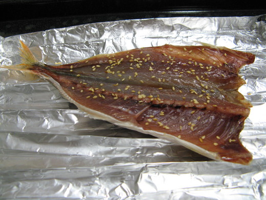 料理的方式可以用炭火烤或烤箱烤,當然要用鍋子煎也沒人說不可以,我把這條魚干丟進預熱200度的烤箱中,烤了約25分就好了。若是像我一樣選擇用烤箱烤魚,可以墊鋁箔紙,或是環保點用專用的烤盤,如果用鋁箔紙,可以將鋁箔紙折成扇形將魚頂高,可以讓烤魚的魚油可以留到下面的溝槽中,而不會沾到魚皮,另外一個好處就是魚皮不會黏在鋁箔紙上而脫皮,當然最重要的優點就是烤完後不必刷洗烤盤,把鋁箔紙丟掉就好,可以省下不少清潔整理的力氣。