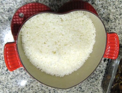 事實上我曾使用過Kuhn Rikon的快鍋、第一夫人的電子快鍋及愛心鍋來煮米飯。Kuhn Rikon快鍋煮的米粒會爆開,剛開鍋時要讓水氣散一下,不然飯會濕濕的,不過每回為了要煮一、二杯米,卻要請出內外鍋這種大陣仗,實在有點累人,而且由於快鍋外鍋裡要放水不能空燒,老是煮沒有油水的食物,總覺得鍋子澀澀的,要一直養鍋。而第一夫人電子快鍋煮出來的飯就是溼溼爛爛的,並不討人喜愛,一直到我換鑄鐵鍋煮飯,才知道什麼叫做QQ的米飯,真是太好吃了!如果硬要排名的話,個人覺得好吃程度是Le creuset愛心鍋>Kuhn Rikon快鍋>電鍋(對外食米飯的印象)>第一夫人電子快鍋。不過聽說用木桶蒸的米飯會更Q更好吃,這部份我還沒嚐試過,只有偶爾吃到有些賣飯糰的早餐店用的飯,真得與愛心鍋煮出來的不相上下,甚至有幾家略勝一籌,即便如此,我也心滿意足,不會想再去弄一個飯桶回來做實驗,所以家裡有飯桶的可以分享一下喔!