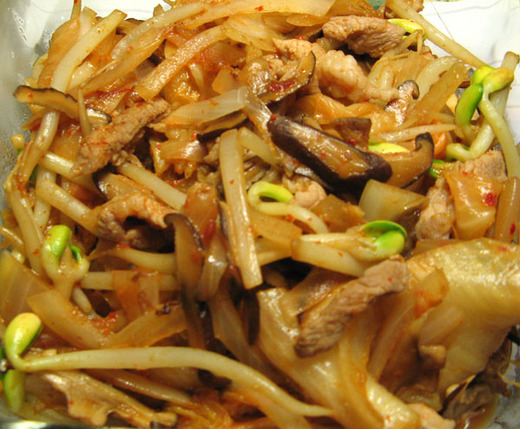 我的泡菜豆芽炒肉絲做法很簡單,準備泡菜、黃豆芽、肉絲、香菇絲、蒜末及洋蔥。倒點油先把蒜末爆香,加入香菇絲炒一下,香味出來後把洋蔥放進去拌炒,一直炒到洋蔥變透明的,放入肉絲拌炒一下,肉絲變色後放黃豆芽,稍微拌一下,加點米酒,蓋上蓋子悶一下。接著打開蓋子,放入泡菜,有韓國辣椒粉就放辣椒粉,沒辣椒粉的放辣豆瓣醬,一點水、醬油(借色,不用太多),拌一拌後加鹽調味,就可以起鍋了。