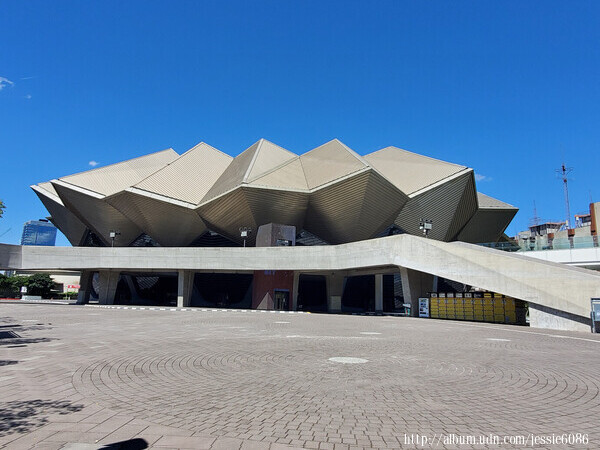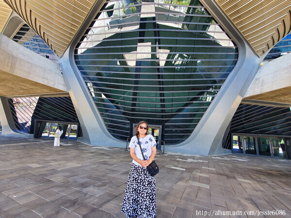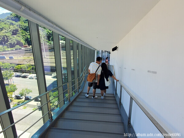 從表演廳外面搭乘電梯至戶外空橋到對面的文化館(不需穿越馬路)