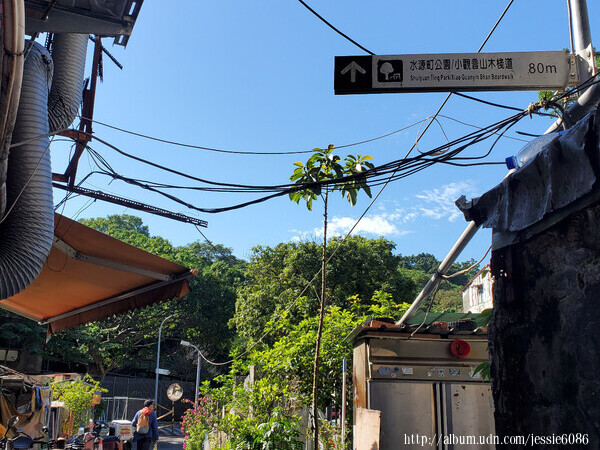 路牌標示「水源町公園/小觀音山木棧道80m」