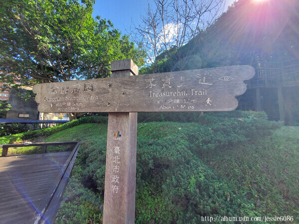建議從捷運公館站1號出口出站,沿著汀州路3段雙號靠邊走,步行至200巷,進入巷內可到水源町公園,小觀音山木棧道的起點從公園開始,沿途綠樹蔭蔭,中段有一休憩大平台,ㄇ字型的木椅可休息,步道全長450M,終點是寶藏巖,所以又稱為尋寶步道。