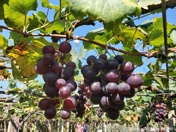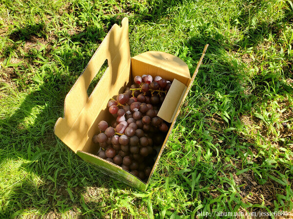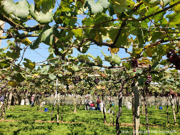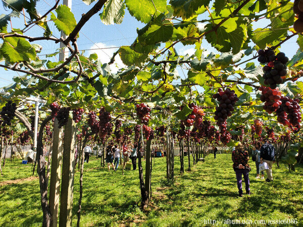 中台灣三日遊的第三天早上是到台中新社參觀國際花毯節,中午享用菇菇火鍋,下午就到新峰農場採葡萄。這個季節葡萄結實纍纍,各個渾圓飽滿,讓人不知不覺地採了許多。農場準備了大、小兩種手提紙箱,1公斤150元,採好就到櫃檯秤重結帳。除了採果之外,9月至12月舉辦「葡萄饗宴」下午茶,這需事前預約不接收臨時報名。