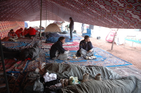 如果把每年的達卡拉力賽,比喻成一趟里程上萬公里的沙漠行軍,那麼沙漠行軍的大本營就是一站一站隨軍前移的「Bivouac」。「Bivouac」是軍旅的臨時駐紮處之意,在達卡拉力賽所到之處,先遣人員都會在維修區旁先用營帳搭起一座?字型的營地,下舖地毯,中燒營火,這就是供車手、技師們休息、用餐的地方,也是整個達卡拉力賽的生活中心。