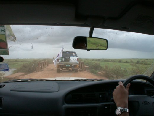 懷著忐忑不安的心情,採訪亞洲拉力賽的中日媒體4人合乘一輛4WD越過泰、柬邊界,沿著5號公路轉6號公路開向吳哥窟。一路上只見兩邊都是平疇綠野,同行的人都很好奇為什麼這樣的好地方任由荒廢,不見人耕作放牧?