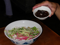 其中主角便是那一小碗的炸醬,這炸醬黑忽忽的、浮著一層油也或許夾雜著少許肉末,但整體而言是醬Sauce,才知那真是用油爆炒過的「炸醬」。第一次來北京的人可千萬不要被前面的戲劇化上菜方式攪到興奮過度而一股腦地倒入麵碗,那是會打死賣鹽的;應該先拌入三分之ㄧ的炸醬嚐嚐看麵是否夠味,然後再慢慢逐次加量一起扮,才不致壞了一碗好麵。
