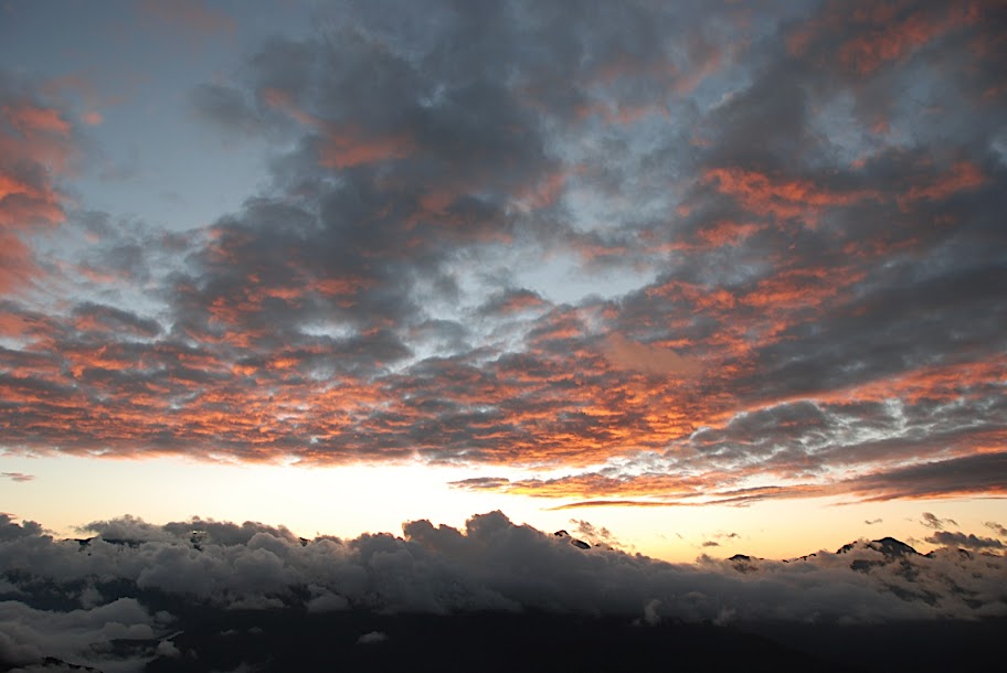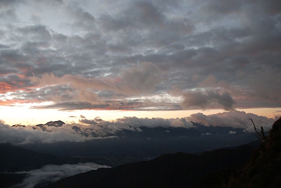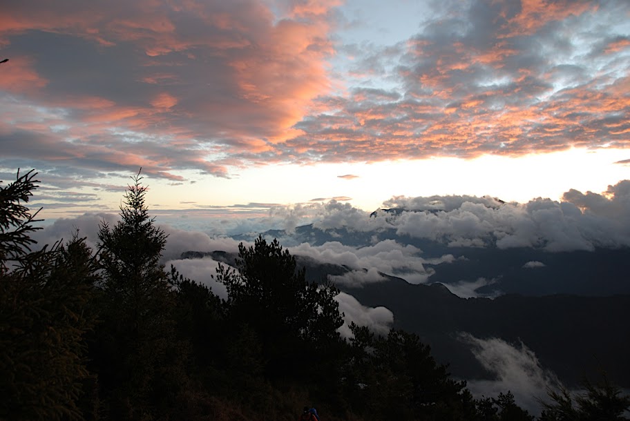 這是中央尖山,彤雲大起,下雪前兆。數小時後,一旁的南湖大山開始下起雪來,這要等到次日從雪山回程時才看得到。