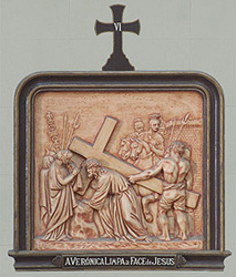 路上有一位勇敢的婦人維羅尼加(Veronica),看到耶穌面頰上的血汗唾污,就奮不顧身,分開群眾,走到耶穌跟前,用面帕擦拭他臉上的血汗,結果,耶穌的容貌神奇地印在面帕上。