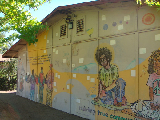 梅村版禪修的報到時間是下午兩點到五點,我們提早一點到達,兩人都是第一次來,看到有個小屋寫著報到處,就請司機開到這裡放下行李,在附近小林間走路等待著報到時間開始 (圖一,二)。等到陸續看到一些車子開始進來,大家卻都往山上走,在路上遇到一位sister問她,原來小禪修活動都會在Solidity hamlet區(男眾法師),行李可以集中會有志工開車統一送上去。炎熱的下午我們開始走上山,沿路看到露營區、禪堂、齋堂,最後終於到了報到區,與一群家長小孩共同自製名牌,在把行李放到寢室,很巧的,我跟香港女士E竟然還住同一間。(圖三:寢室外壁畫)