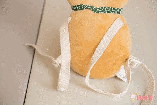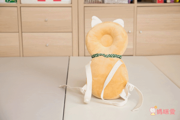 雖然產品訴求是要保護寶寶的頭部,但使用方式並不是呆板地把寶寶的頭包起來,而是利用兩條背帶,讓寶寶像背個小包包一樣,將超可愛的柴犬玩偶背在背上,既不悶熱、也大幅減少了寶寶使用時可能的抗拒感。你們看龍龍背得多開心!