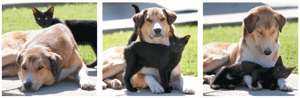 美國俄亥俄州中田市一戶人家的黑貓,見鄰居家的狗兒趴著曬太陽好像很舒服,跟這位新朋友連招呼也不打,上前直接鑽到牠胸前,像躺沙發一樣舒舒服服靠著休息。圖/美聯社