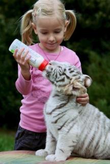 德國小女孩十二日在艾錫迪動物公園,餵七週大的白老虎喝奶。歐新社 九十七年十月十三日