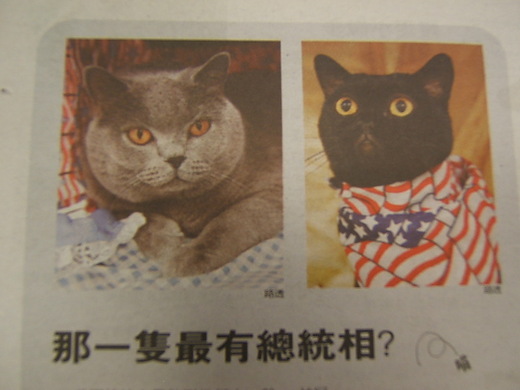 美國總統大選熱烈進行中,競選活動繁多二位候選人歐巴馬與馬侃抽空到紐約出席貓展?事實上,參加的可不是這2位總統候選人,而是1隻名為歐巴馬的孟買貓(Bombay cat),以及1隻名為馬侃的美國短毛貓(American Shorthair),牠們可是最佳總統代言人呢!
