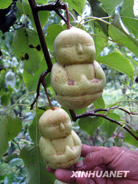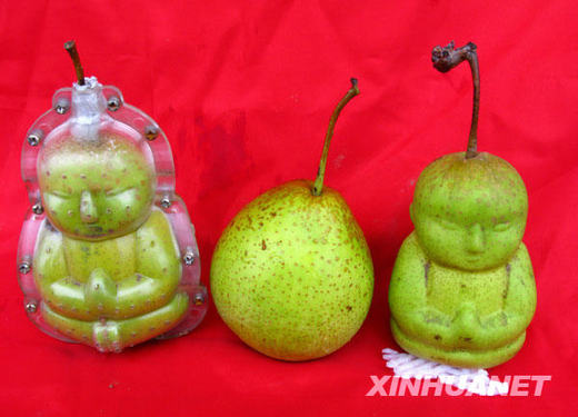 河北省邯鄲市魏縣魏城鎮梁河下村果農蒿現章2003年開始試驗培育藝術水果造型,今年成功培育出萬余個外型酷似菩薩的造型梨,當地人取名叫「人參果」,每個批發價達50元左右,相當於250元台幣。雖然價格貴,但外型討喜,已成為大陸最受歡迎的水果之一。下圖是8月29日拍攝套模的梨(左)與普通梨(中)。新華社發(王九忠 攝)