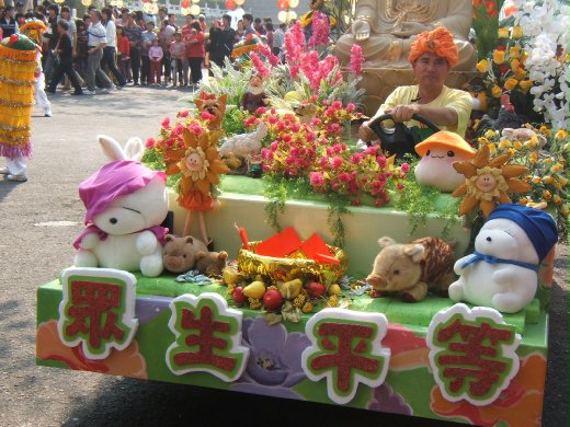 接下來,當然不得閒,四處去~~ 佛光山上..有大慈育幼院、普門中學的樂隊,還有許多育幼院花車、表演,台北松山寺舞獅團...熱鬧得不得了。印象最深的是,去幫忙掃不二門廣場的地,花姐掃地的模樣...令人哭笑不得,因為掃葉子的掃把和一般的掃把不同~ 她很想哭,怎麼掃都掃不起葉子,唉呀! 原來她太用力了,輕輕揮不就得了。只是,葉子掉不停,真想把樹全抱起來藏,哈!