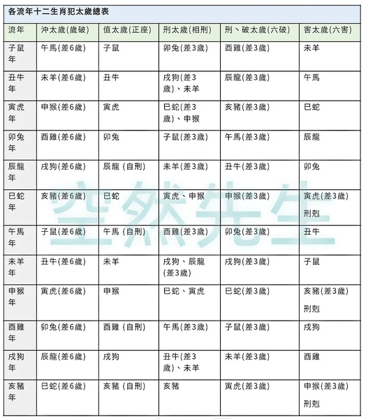 就因為神聖不可侵犯,犯太歲的生肖越多越好,神煞也是越多越好,12生肖都來安,不然宮廟要如何發大財?不過,一般認為沖太歲最凶,再則坐太歲,至於刑害破的傷害力微乎其微,並不需要。因為古書云「支神以沖為重,刑與穿兮動不動」。另外,您會發覺:為何都只看流年地支(太歲),和本命年柱地支(生肖)的作用,天干的作用反而沒提到。這是因為地支的作用力較大,古書云「天戰猶自可,地戰急如火」,又云「干多不如根重」。