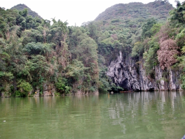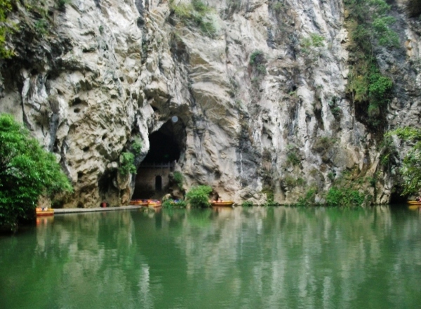 坐了二趟公車終於到達天河潭, 可花了我二個小時的時間, 天河潭門口有個狀似五星級的厠所, 因為厠所有桌椅讓人休息, 還有音樂, 但里間的厠所就馬馬虎虎差強人意, 買票進景區, 電瓶車送我到水洞入口, 原來這個景區號稱是貴州的溶洞瀑布的精華版, 溶洞又分水旱二洞, 我先乘船遊水洞, 感覺蠻大的, 里面景緻比龍宮生動些, 美女剪影及姜太公釣魚最為傳神, 船老大把船划出洞外, 湖底清楚可見水草搖曳, 打著傘乘船欣賞風景, 別有一番情趣;