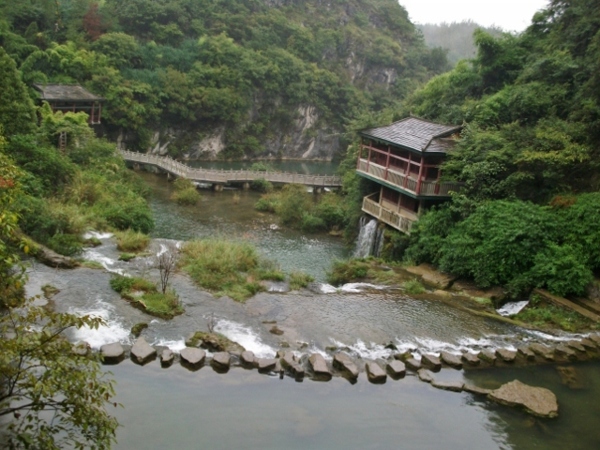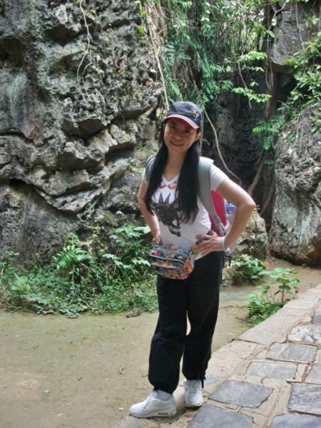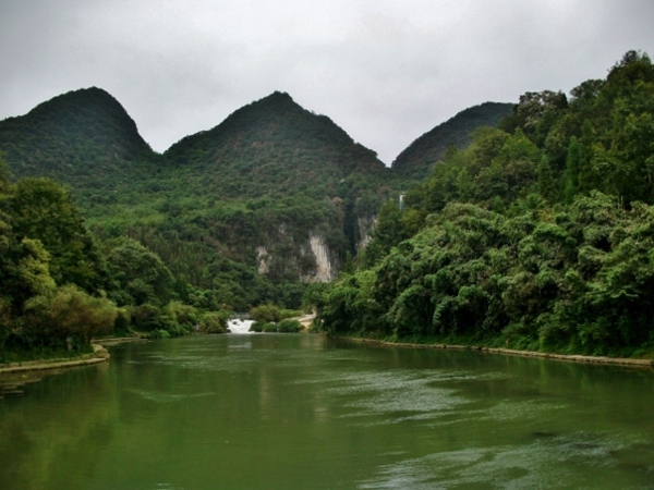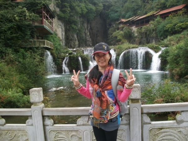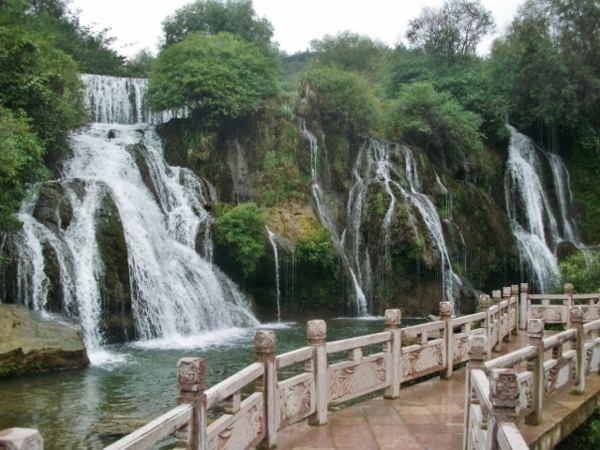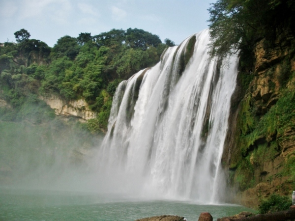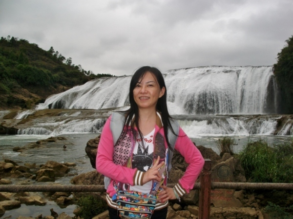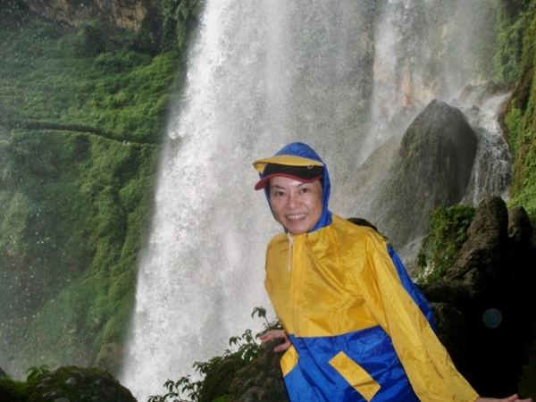 終於到黃果樹大瀑布景區, 先乘了電扶梯下到谷底, 即見瀑布下游寬廣綠盈盈的水面, 第一次見到大瀑布一隅時, 真是異常興奮, 那個轟轟水聲老早就遠遠喊著叫我靠近再靠近點, 等到和它全面接觸時, 已被它狂瀉而下的水氣, 噴得一身濕意毋須言語, 其高74米寬81米高大挺拔的身形, 雄糾糾氣昂昂, 在六個觀景台各有不同姿態迎接我, 最令我感動不已的是, 整日陰霾的天氣後, 此時太陽居然也露臉和我打招呼, 還眨著眼頑皮地把彩虹掛在大瀑布的腳邊, 讓我驚喜得尖叫起來; 走進隠身於大瀑布腰際的水濂洞, 先是得痛快淋漓的接受大瀑布的洗禮, 才能體驗和它最近距離的貼心接觸, 不但可如雷貫耳的聆聽澎湃的轟隆聲, 還可就近摸它一大把呢! 真是好不快活, 等我們走出黃果樹大瀑布, 太陽竟也不見踪跡, 天氣一如早上的陰霾, 能夠驚鴻一瞥彩虹掛在大瀑布, 竟成為我此行的最大幸運之說.