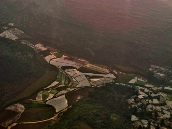 . 飞機在快抵貴陽時, 從窗外看到饅頭山很有親切感, 陽光白雲把梯田映得更夢幻了, 隨手拿起相機狂按, 試圖抓住屬於我的那一畝田. . 搭機場大巴到火車站, 買火車票時才知最近一班到鎮遠的是20:10, 真是謝謝, 我扛著我那19公斤的行李箱, 一步一腳印的爬上階梯月台, 一時竟感前途坎坷啊! . 終於在凌晨12點抵鎮遠火車站, 將我的行李扛下月台時, 已經累到一個程度, 上了出租車直奔酒店, 車資只要了我5元,大半夜了還這麼便宜,有點小意外, 由於是淡季, 客棧應該只我一人入住, 侗族的老闆娘在前台等我呢! 家庭式的旅店住起來很有安全感, 但臨街就是吵, 一亱輾轉難眠啊.