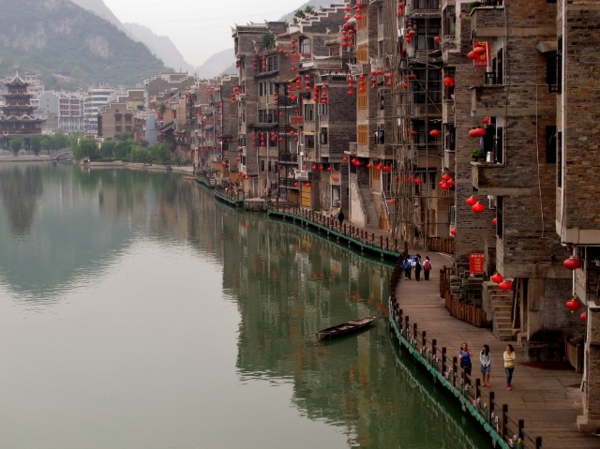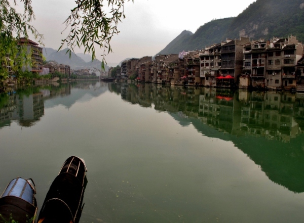. 一早7點起床, 在房里吃著我的蜜麻花配咖啡, 就先到古城河邊採景了, 天陰陰的, 涼涼的很舒服, 等到近9點才坐上遊舞陽河的車, 散客就是有點小麻煩, 接來接去的, 上船就近十點了, 在船上觀看青山碧水, 很是愜意, 也有服務人員報景, 什麼西天取經, 孔雀開屏, 大象喝水, 五老峰…等, 像不像不重要, 我要的是一個人自由自在的觀景呼吸, 原路返程時, 我便自個找樂趣, 蹲在引擎濺起的水花邊上乱按快門, 煞是有趣. . 中午12點多才回到酒店, 我並不餓, 遠在台中的媽媽身體狀況不好, 一直在聯絡她的就医事宜, 心里也七上八下的, 很不平靜, 一點多真餓了才吃了碗泡面, 泡面真是旅客的好朋友, 吃起來特別有滋味, 三點多整裝出發, 逛傳說中的純樸古鎮.
