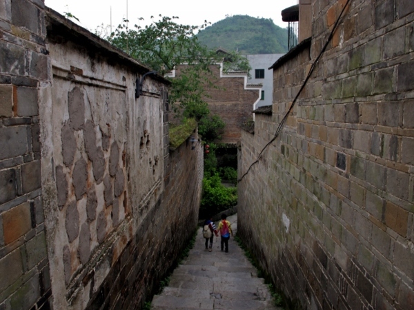 . 這個鎮不大, 我從酒店後邊的河邊, 朝青龍洞方向慢行, 二岸的建築古色古香, 各異其趣, 河面上映出的倒景, 淨淨青青, 讓人迷惑在虛實之間, 錯落在其中的柳樹枝椏搔首弄姿, 把河面弄得春心蕩漾, 不得安宁. . 青龍洞的古建築群, 確實特別, 但没吸引我購票參觀, 只在門外和他對望, 就行逕古橋, 也就是祝聖橋, 過橋後就走到了古鎮街上, 對於常旅遊的我來說, 二邊的店家儘管五花八門,但都没能吸引我上前一探究竟, 我直接走進巷弄里, 要去領略聞名的斜門歪道, 穿堂過巷, 對没有方向感的我而言, 應該是種冒險吧, 這斜門歪道雖無邪氣, 但人烟稀少, 初來乍到的我有點小心慌呢! 正好半道看到二個小三女孩, 就請她們帶我走嘍, 二個小美女放學是邊走邊玩, 我樂於當個小跟班, 也邊走邊拍, 她們把我帶回街上後就一溜烟的跑走了, 我順著街走, 很快就到新大橋.