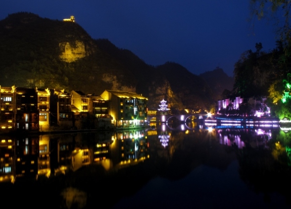 . 這太陽還不下山, 我們已飢腸轆轆, 就找了臨觀景台近些的餐廳點菜吃, 準備吃完去照亱景, 這餐廳也可看得到苗寨全景耶, 菜來時, 我架上腳架準備迎接亱色, 亱是悄然來了, 灯也三三兩兩的亮起, 但我覺得這苗寨的亱景太單一了, 有點像萬家灯火, 拍來几張效果一般, 網上都說了西江千戶苗寨的亱景, 像天使的翅膀, 我是看出來它的样子了, 但没有太興奮. 二個人結伴AA吃晚餐是很好的主意, 這样可以點菜, 不然我怕是又要吃泡面了, 雖然菜不怎麼美味, 但有温情.