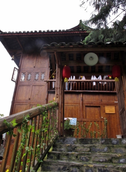 . 為了体驗住吊腳樓, 我在網上已訂好一家, 但放眼望去山坡上都是吊腳樓, 我去電請老板來幫我抬行李, 這年輕人是老闆的朋友, 老闆考試去了, 他幫忙看店. 真不愧是吊腳樓啊, 在半山坡上用木板蓋成的一幢幢特色建築, 我的房間在3樓, 地板走起來嘎嘎地響, 淡季,看起來好像没什麼人住,房間有一獨立浴室, 木板的門, 木板的窗, 呵呵, 好單薄的房間啊, 好像擋不住大野狼的耶, 但我也没時間多想, 已經三點了, 我要快點出門看景照相呢!