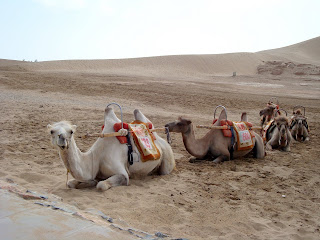 到鳴沙山、月牙泉停留時間沒有辦法太多,因為夏日的這裡溫度高、烈日當頭,曬上一個多小時就讓人頭昏、口乾舌燥。我沒像旅行團的遊客騎著駱駝隊在烈日下酷曬,也沒像少數的冒險者爬上陡峭的沙脊頂去滑沙。我慢慢的沿著零落的樹陰晃蕩,尋找美麗的景色,感受這短暫在沙漠裡的孤寂。。。