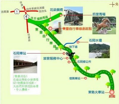 石岡水壩在921後有所破壞,之後有補強的工程,在石岡水壩可以停留一下,到處走走欣賞一下水壩的風景。而穿過花樑鋼橋前可以停下來看看這花樑鋼橋的介紹,了解其特殊處,而在橋上也可以短暫停留,欣賞二岸大甲溪的風景,同時還可以看到之前風災沖斷了正在重建中的壽豐大橋。可惜我沒體力騎到石岡車站,據說車站除了懷舊景色外,車站外還有一塊因為921地震而凸起的地層面,可以感受到當時地震的威力有多大。