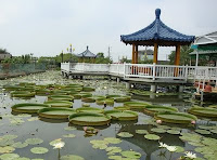 這個時節許多蓮園很明顯的因為蓮花開過了一輪,逐漸乾枯變黑了,但也還有許多蓮園田正綠油油的迎風搖曳,荷葉間有許多含苞待放的蓮花點綴其中。優閒的開著車逛著一畝畝的蓮田,轉個彎突然看見一個有著美麗造景的蓮花亭園,門前有著許多停車位,很自然的我就在這裡停了車。