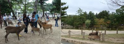 第三天的自由行,我們選擇車程一個多小時的奈良,也是一個歷史悠久的古鎮。奈良有東大寺,是日本很且具歷史意義的寺廟,還有許多自由走動的野生鹿的奈良公園。東大寺有1300年的歷史了,許多部份正在重新修建或維護中。而奈良公園是佔地很大的一個公園,園裡有許多寺廟例如東大寺、春日大社、興福寺,和專門展出佛教藝術品的奈良國立博物館,最大的特色是公園內數百隻自由走動的鹿。這些鹿因為被視為是神道教中神明的使者,變成奈良城市的吉祥物兼國寶,所以在這個公園裡被保護著。路邊有賣鹿吃的餅乾讓遊客可以餵鹿,不過呢,我覺得這些鹿已經被遊客寵壞了,知道遊客手裡、口袋裡可能有吃的,許多遊客被貪心的鹿死纏,不小心還會被咬一口呢,還好鹿沒有尖牙,公鹿的鹿角也都被鋸斷,這些鹿並沒有危險性。