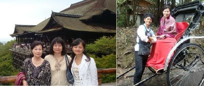 寺的下方可以俯望斷崖,如果不是因為到訪的時候陰雨綿綿,這景色應該是很美麗的。寺前的產寧步道,有著兩排長達200公尺的各種京味小舖,最有名的紀念品是包著各種餡料的四方餅,以及各種醃的醬菜。許多店提供試吃,一路邊吃邊並能參觀各種日本手工藝【西陣織會館】參觀和服,是旅行團的經濟觀光行程,日本和服最具代表性的西陣織,據說是不可錯過,但除了和服的鮮豔華麗以外,我怎麼都看不懂特色在哪裡。大阪的【道頓崛、心齋橋】是最有名的購物區,搭地鐵到處逛很是容易。國際化的結果讓世界各地的購物環境現在都快差不多,除非折扣季節,否則現在日幣升值後,我們怎麼看也不覺得有什麼可以買的。
