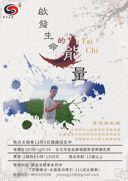熊氏太極拳 中華熊氏太極拳總會 宜蘭縣擎宇武學研究協會 台北推廣:12月開班招生中 1、每星期日晚上7:00~8:00 自由廣場國家音樂廳走廊 教練:黃俊維 2、每星期三晚上7:30~8:30 大安區...