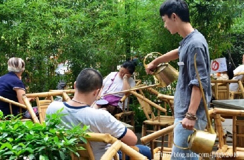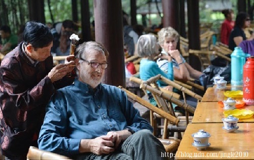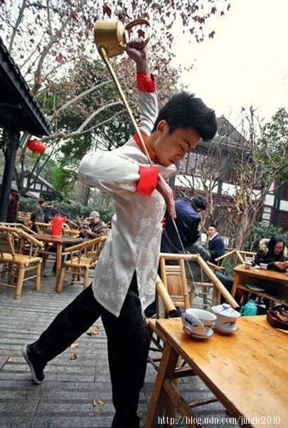 上圖服務生手裡拿的長嘴水壺,是成都茶文化的特色之一,這個長嘴水壺也有一個典故,根據傳說:「乾隆皇帝微服出巡的時候,走累了覺得口渴,進茶館休息,看到店小二舉著長嘴茶壺為客人沖茶,覺得很有趣,於是借來玩一玩,為幾個隨從添茶倒水,把隨從的太監嚇壞了,又不能聲張怕暴露身分,太監們急中生智,立刻把食指和中指彎曲起來,在桌面上敲三下。」這是什麼意思呢?您看這兩根指頭彎曲像不像兩腿下跪,敲三下就是磕三個響頭,太監們用這方式向皇上下跪磕頭呢。後來流傳在民間,用手指在桌面敲幾下,表示謝謝別人倒茶。