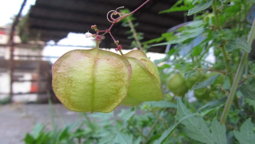 倒地鈴的蒴果呈三角稜狀,吊掛在藤蔓上,狀似鈴鐺與燈籠,有膨脹苞囊保護種子,用力擠壓會發出「劈朴」的聲音,裡頭有三顆圓形種子,成熟種子為黑色,上頭有白色「心」形斑(上網查詢發現這個小秘密,又回宜蘭補拍了種子),真是超可愛的啦,夏季開白色小花,花形像迷你蘭花,球果下方有蜷曲絲鬚,葉呈鋸齒裂葉。別名多是因其三角形膨風囊果、擠壓發出聲響的特點而得名。