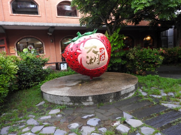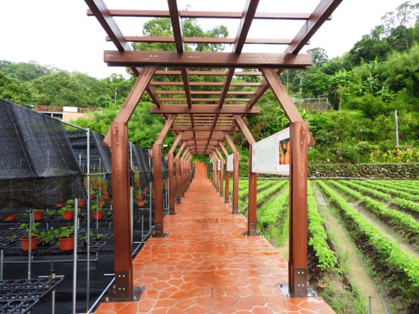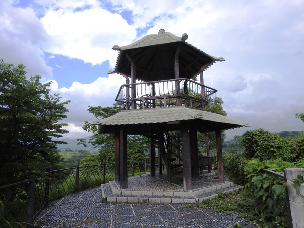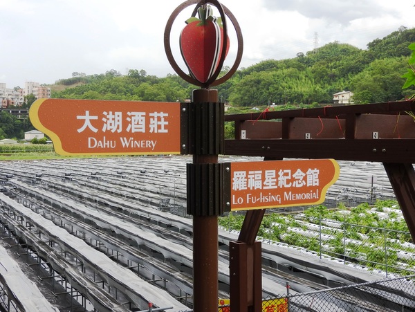 紀念館後方的攬勝亭,中國亭閣樓台,造型典雅,走廊、扶梯連通紀念館各樓層,攬勝亭緊鄰十寮坑山崖,腳下有田疇阡陌縱橫,視野極佳駐足亭閣,大湖盆地青山綠水,草莓田園風光盡收眼底,田疇縱橫中,台3線車流、大湖酒莊、草莓文化館清晰可見,展現大湖鄉淳樸美麗的一面。