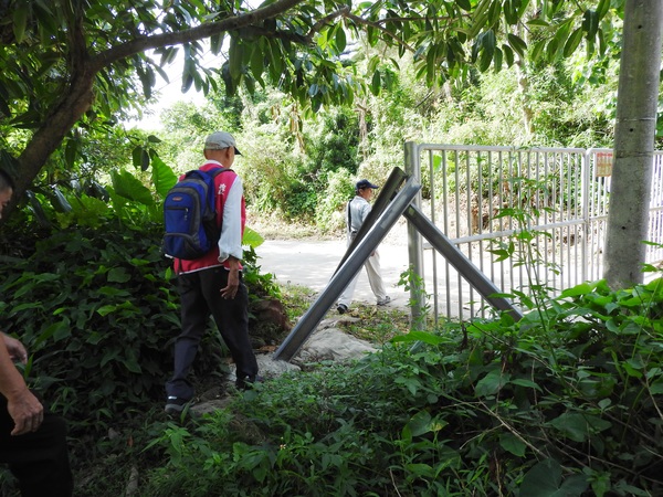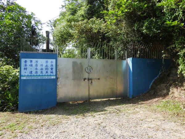 09:17 西勢水庫大門口,鐵門深鎖,後方可看到「基隆水道貯水池記念碑」(2005年當時還沒有管制,甚至我還隨登山隊溯溪到暖東峽谷)