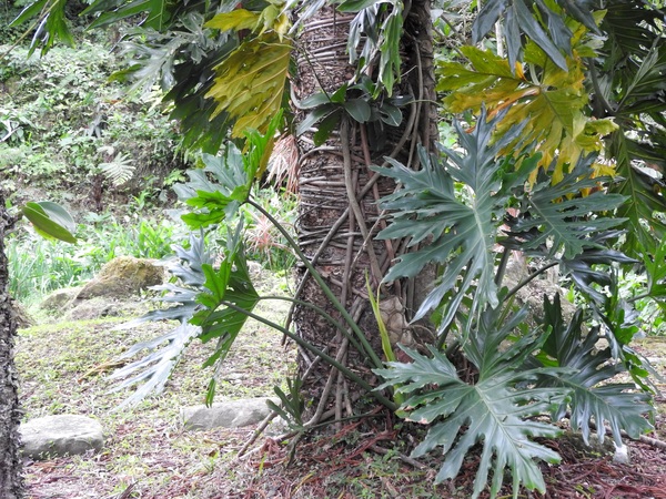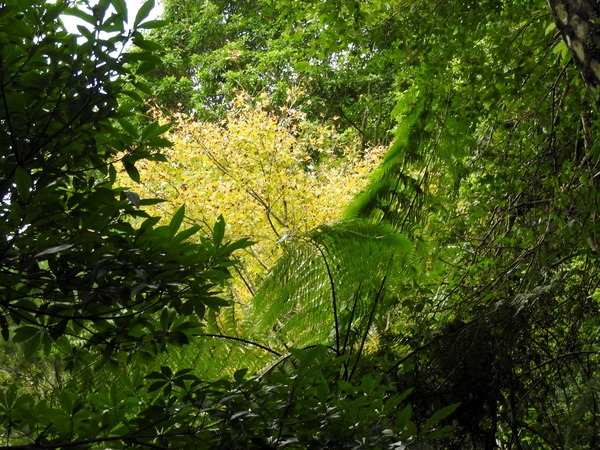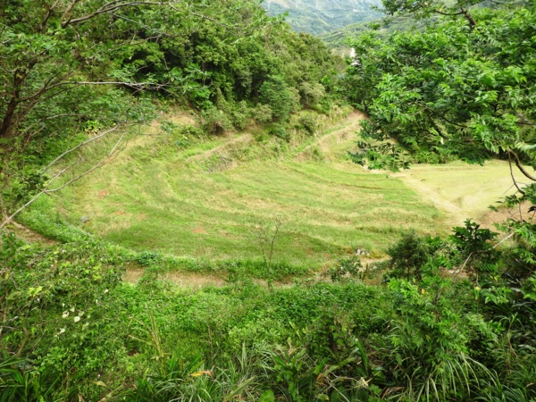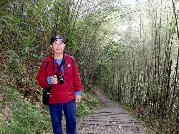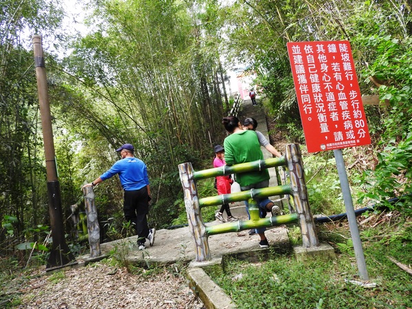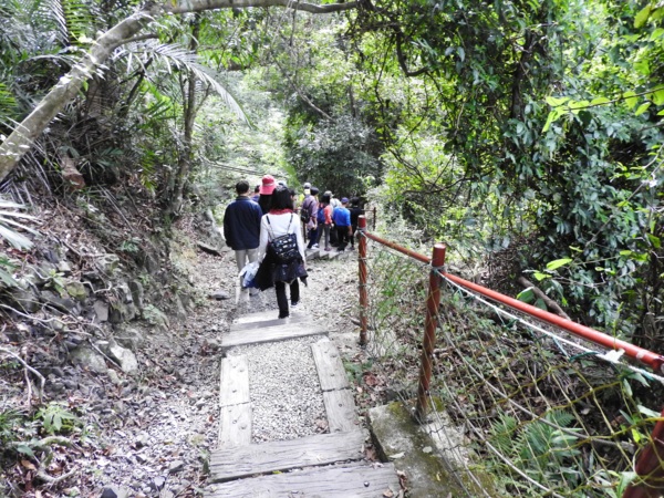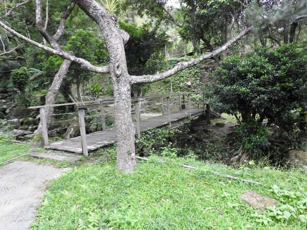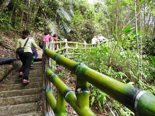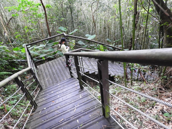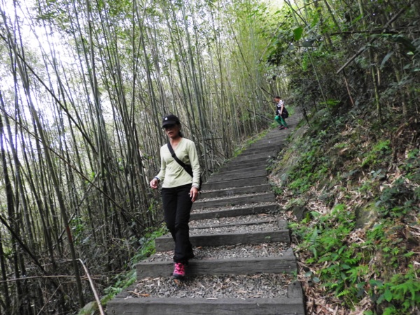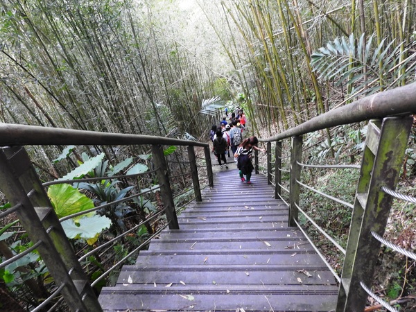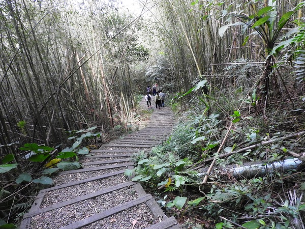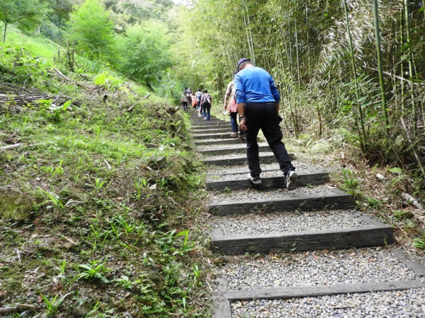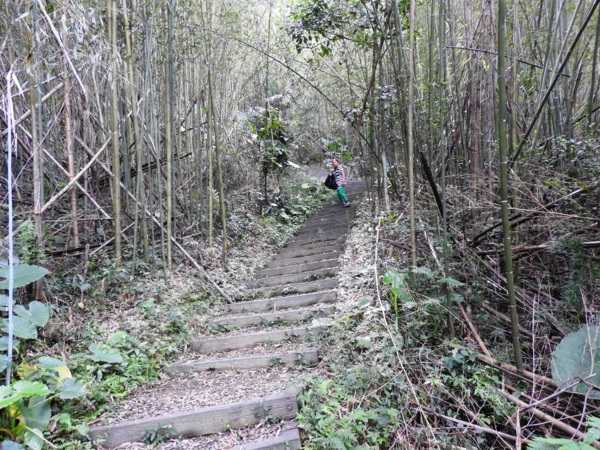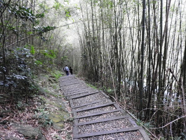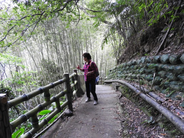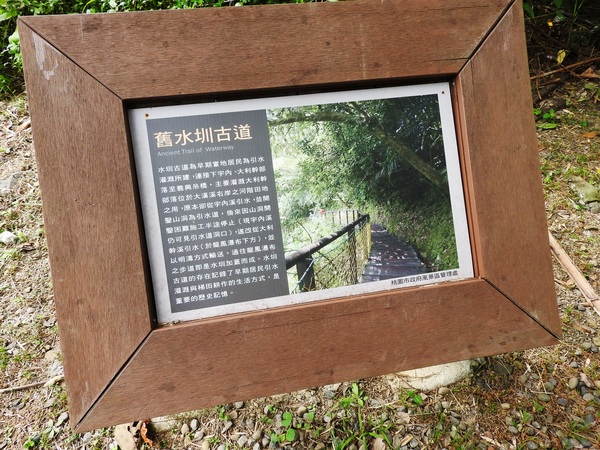 桂竹林間陡下木棧階梯,這是昔日的舊水圳古道,舊水圳引自龍鳳瀑布的大利幹溪水,沿著山路到達義興吊橋,再經由吊橋輸送至羅浮地區的河階梯田,舊水圳已沒有作用,取而代之的為水管輸送,一樣是引自龍鳳瀑布上游溪水。