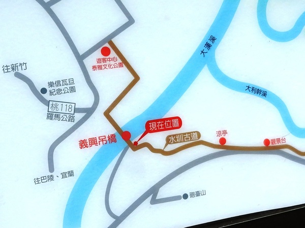 建於民國55年的義興吊橋是桃園唯一水管橋,原為引水灌溉附設水管,2013年經整修,通行人數從單次10人提升至100人。義興吊橋長約200公尺,站上鐵網橋身、木頭鋪面、15層樓高(約70米)的吊橋,帶著彷彿走鋼索的刺激感,俯瞰大漢溪谷的迷人風景,潺潺河水聲令人身心都備感舒暢!