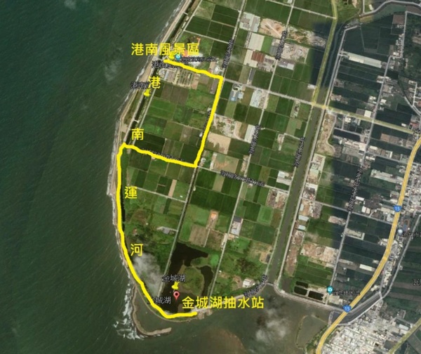 金城湖賞鳥區早期為調節海埔新生地水位之用,現今則是港南地區農田的主要排水口。金城湖的潮間帶中有著許多的海濱生物,吸引鳥類前來覓食,而湖中央的兩塊沙洲就成了鳥類棲息的場所,每當漲退潮之際是賞鳥的最佳時機,金城湖也是港南地區最佳的賞鳥地點。