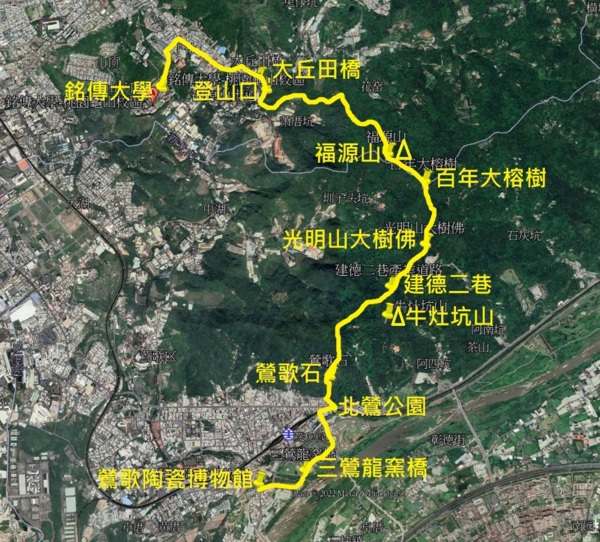 鶯歌陶瓷博物館站→三鶯龍窯橋→北鶯公園→鶯歌石→建德二巷→光明山大樹佛→圳頭山→登山口→大丘田橋→銘傳大學