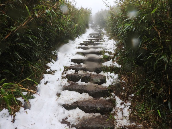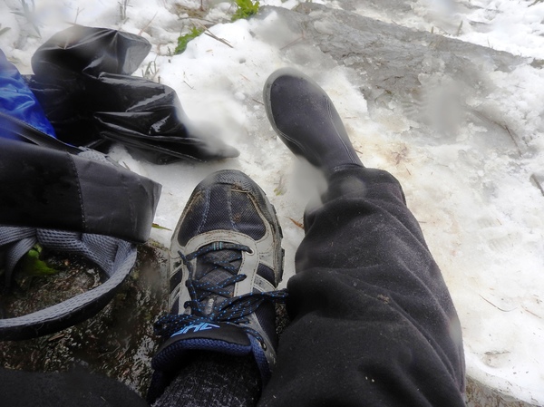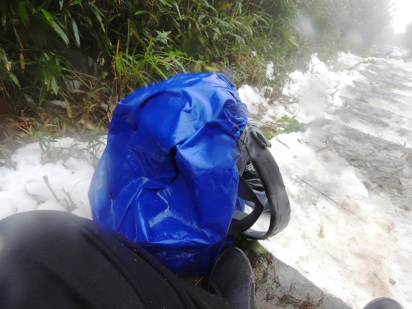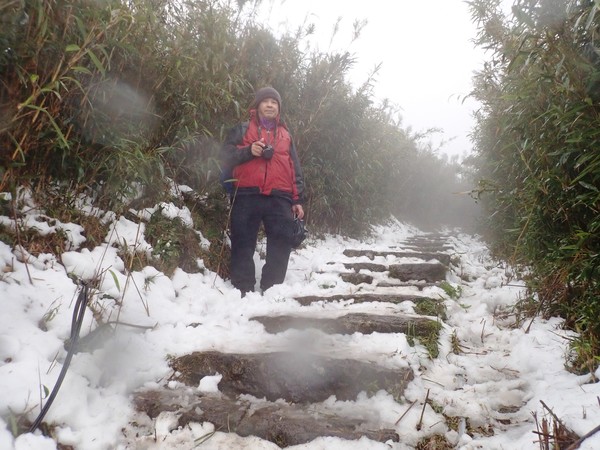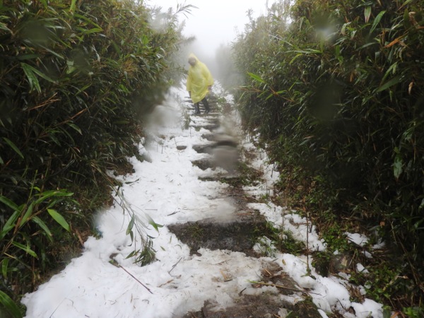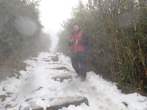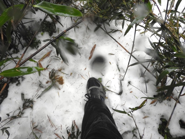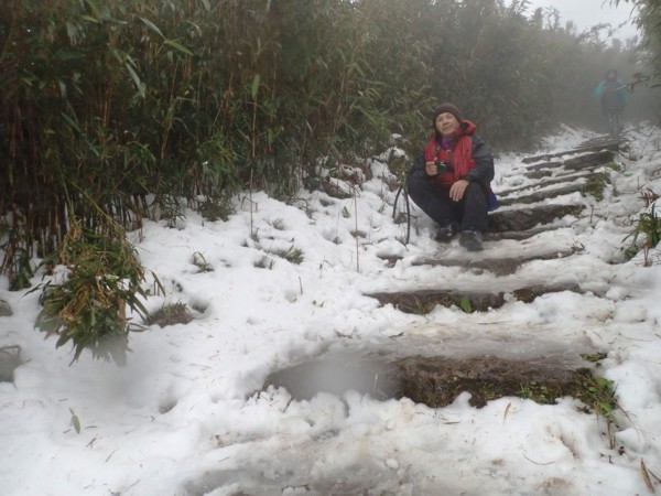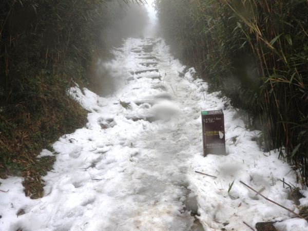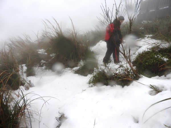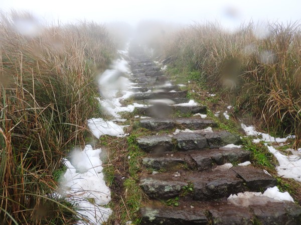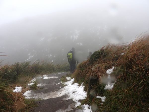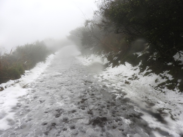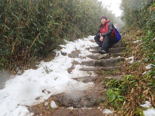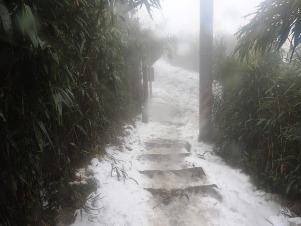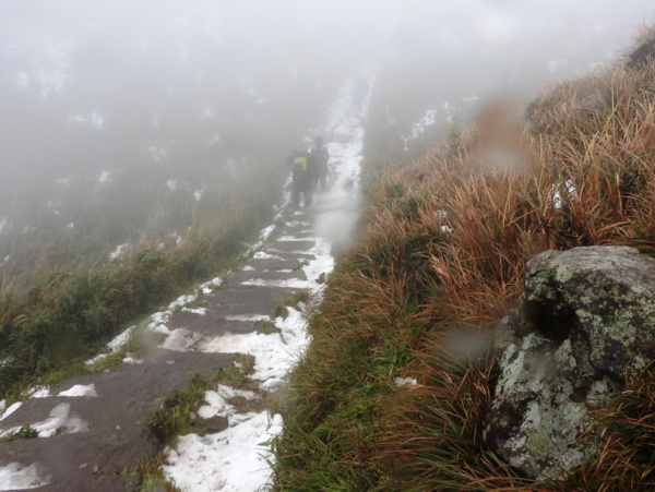 10:49 大屯鞍部登山步道殘雪濕滑,換上溯溪防滑鞋