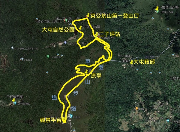 二子坪站→菜公坑山第一登山口→大屯自然公園→二子坪站→走車道到涼亭→走登山步道到觀景平台→走車道回二子坪站