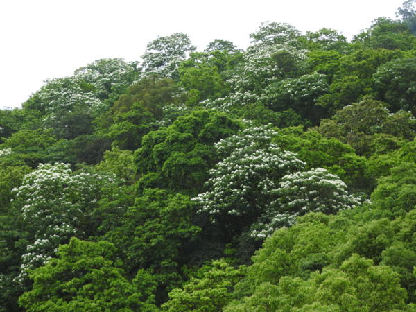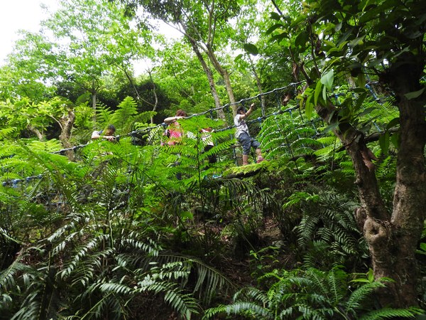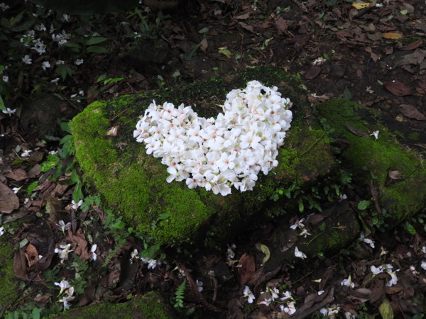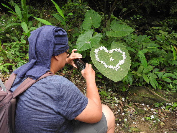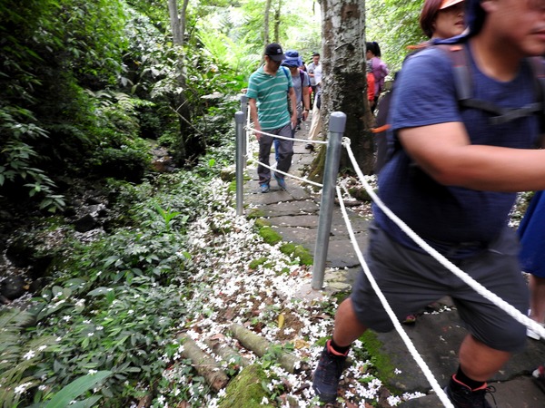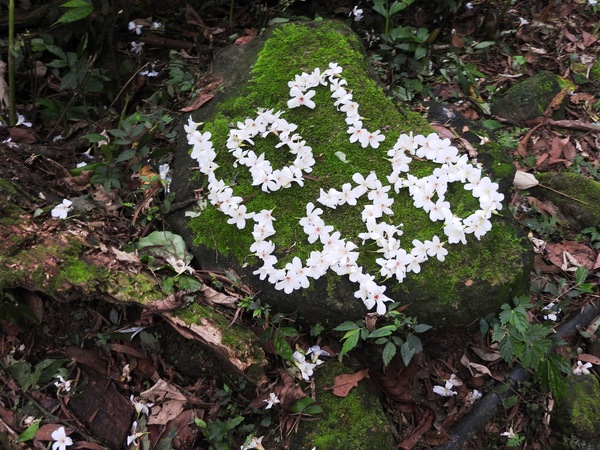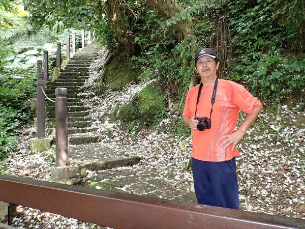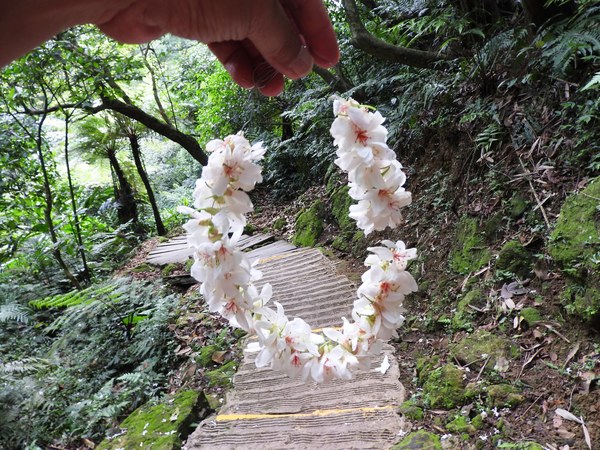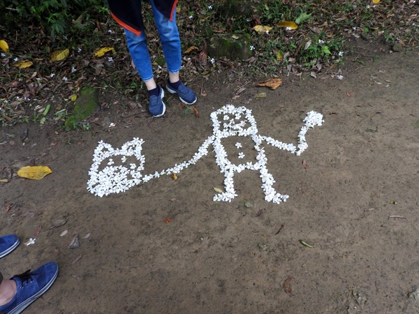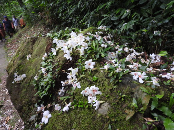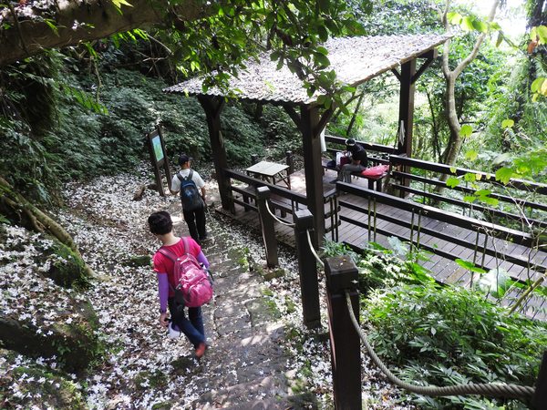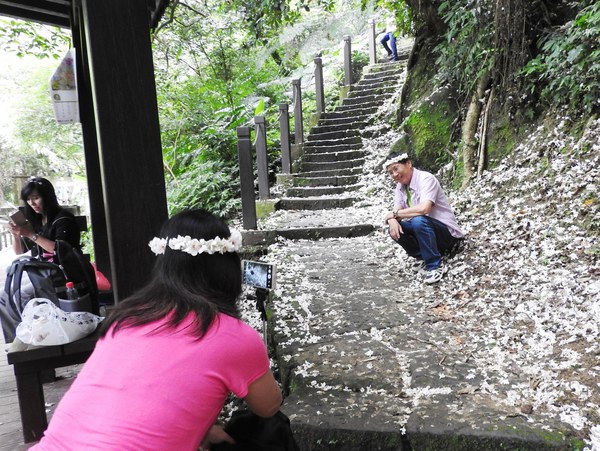 12:12 木棧道涼亭旁桐花落花不少,在此編織桐花花環