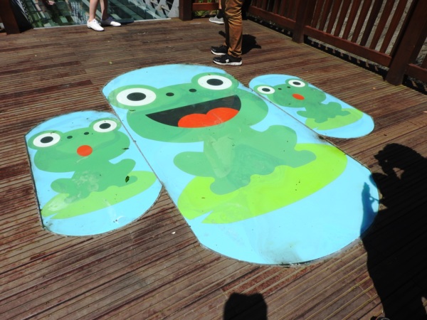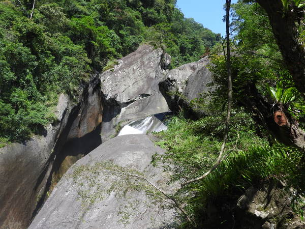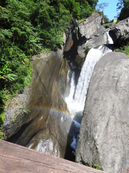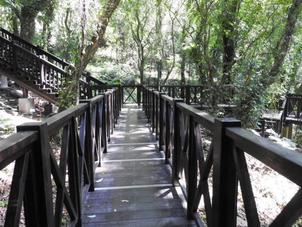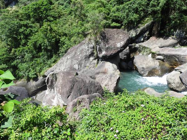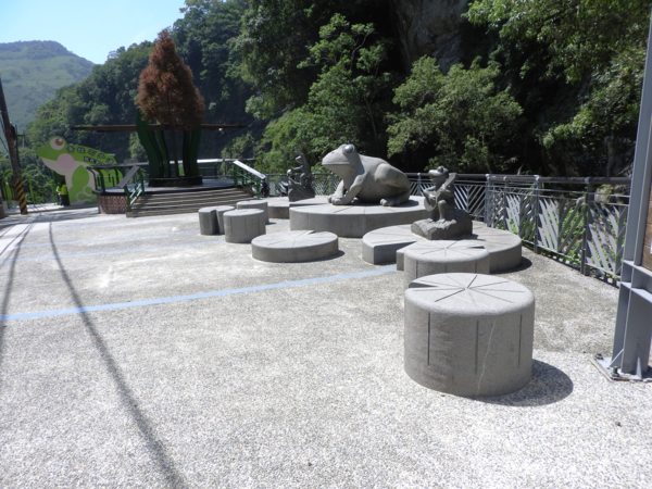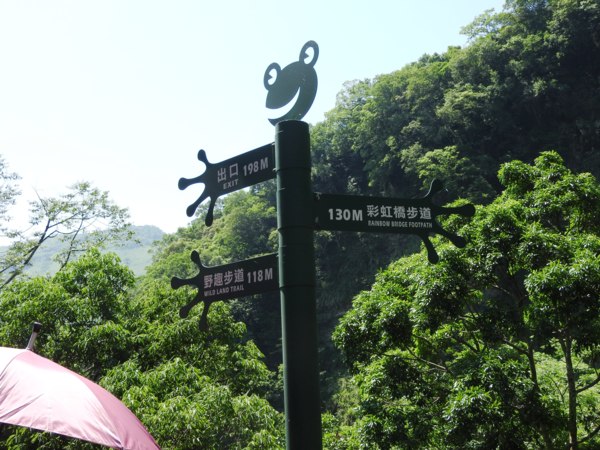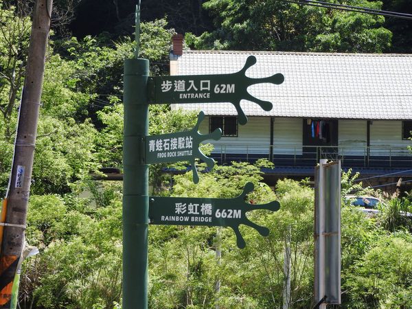 青蛙石取名自河道中有一顆狀似青蛙的天然巨石。當陽光照射瀑布,40公尺高的飛瀑會產生一道彩虹,所以本段步道命名為「彩虹橋」。